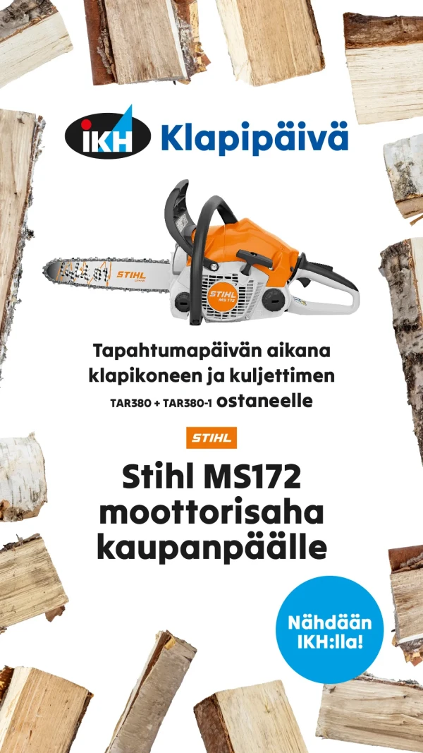 IKH Klapipäivä saapuu Saarenpää Oy:n Alajärven toimipisteeseen perjantaina 20.3. klo 10–15. Päivän aikana luvassa on työnäytöksiä, klapikoneiden ja metsätyövälineiden esittelyä sekä pilkotut hinnat vain tapahtumapäivänä. Mukana myös STIHL ja MHY Suomenselkä. Kevään metsätyöt ovat ajankohtaisia Etelä-Pohjanmaalla – tervetuloa mukaan!