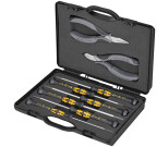 - 8-osainen, täytetty kahdella Knipex elektroniikkapihdillä ja kuudella Wera elektroniikka-ruuvinvääntimellä, versio ESD, sähköistä purkausta poistava