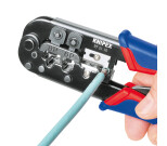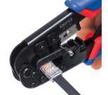 - 6- ja 8-napaisten Western-pistokkeiden, tyyppi RJ 11/12 (9,65 mm leveä) ja tyyppi RJ 45 (11,68 mm leveä) puristamiseen