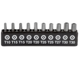 - 10 kpl ruuvauskärjet Torx (25 mm): TR10 - TR15 (x2) - TR20 (x2) - TR25 (x2) - TR27 - TR30 (x2)