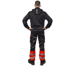 Musta "verkkatakkimainen" työtakki hupulla. Huppu on säädettävä ja irroitettava. Tummat, painetut heijastimet.
