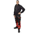 Musta "verkkatakkimainen" työtakki hupulla. Huppu on säädettävä ja irroitettava. Tummat, painetut heijastimet.