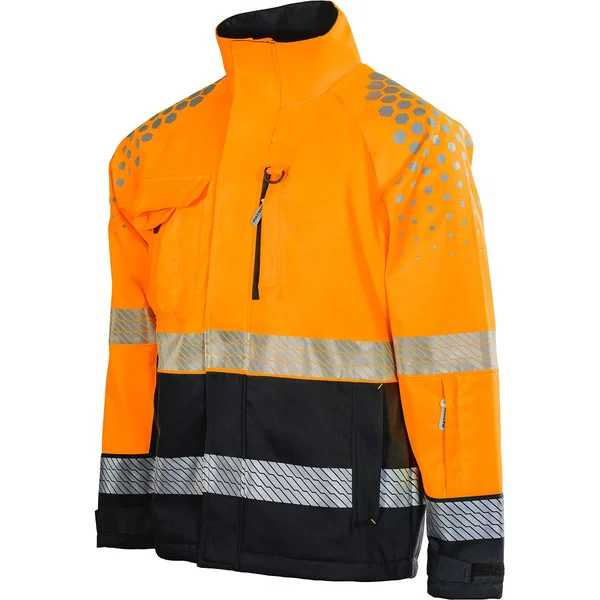 Patron huomiotakki m Dilan hi-vis oranssi/musta. Materiaali: 77% polyesteri, 20% puuvilla, 3% elastaani. Heijastimet hihoissa. EN ISO 20471:2013 luokka 2.