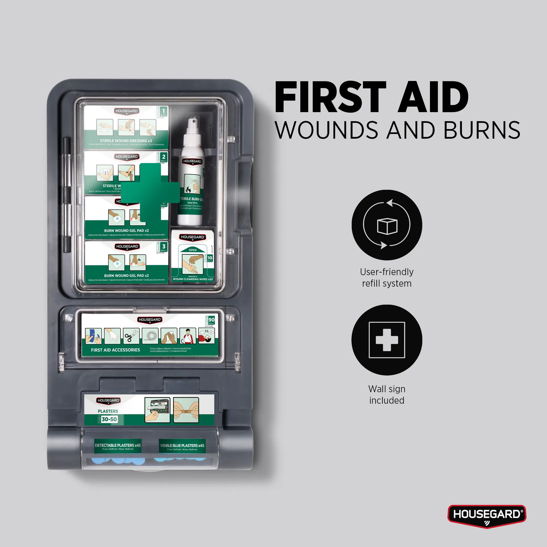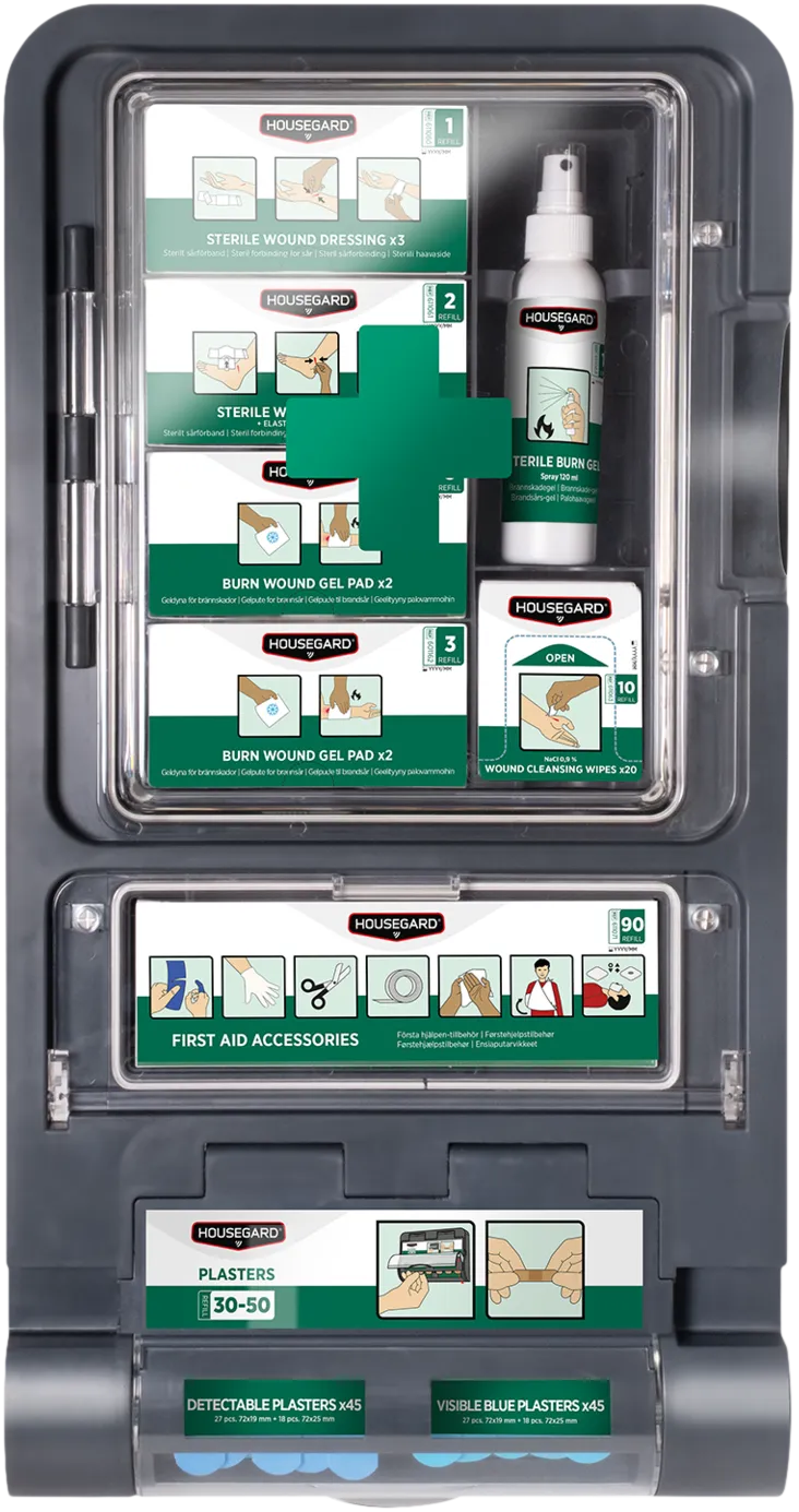 Housegard GPT611041 Ensiapu- ja Palovamma-asema on suunniteltu ympäristöihin, joissa tarvitaan välitöntä reagointia sekä haavoihin että palovammoihin.