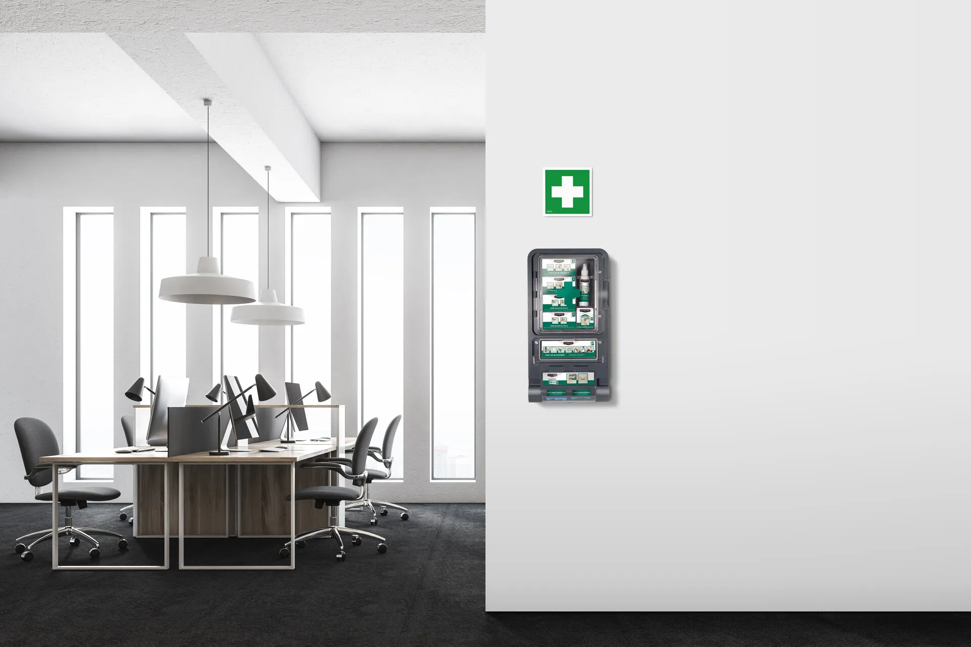 Mukana toimitetaan seinäteline, kiinnitystarvikkeet sekä selkeä "Ensiapu" -seinäkyltti, jotta asema löytyy hätätilanteessa nopeasti.