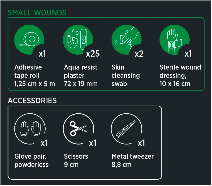 Pieni koko ei tarkoita puutteellista varustusta. Laukku sisältää keskeiset tarvikkeet pienten haavojen ja ruhjeiden hoitoon sekä tarvittavat suojavarusteet turvalliseen ensiapuun.