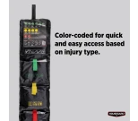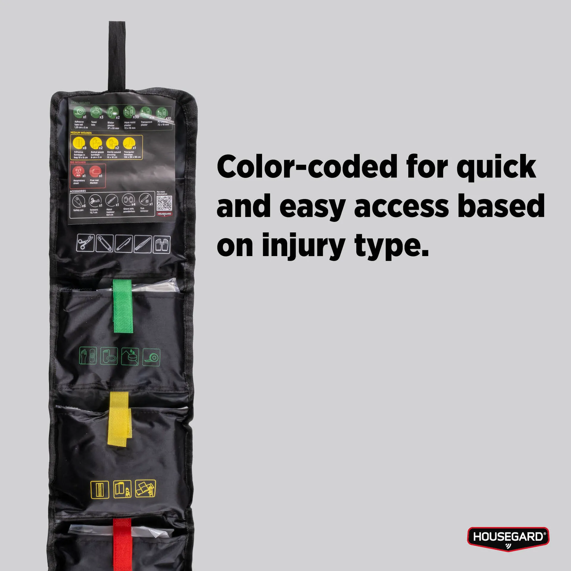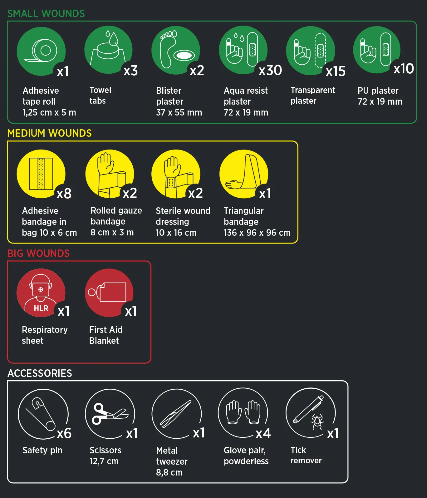 • 89-osainen sisältö on suunniteltu nopeaan reagointiin. Laukku sisältää tarvikkeet pienten ja keskikokoisten haavojen hoitoon sekä tärkeät välineet suurempien onnettomuuksien ensiapuun, kuten hengityssuojan ja ensiapulämpöpeitteen.