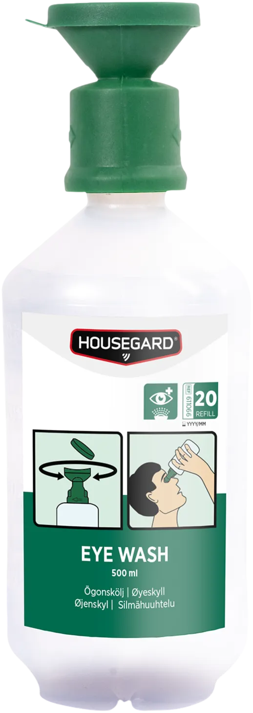 Housegard Silmänhuuhtelu 500 ml GPT611066 on tarkoitettu silmien välittömään ja runsaaseen huuhteluun tilanteissa, joissa silmään on joutunut: