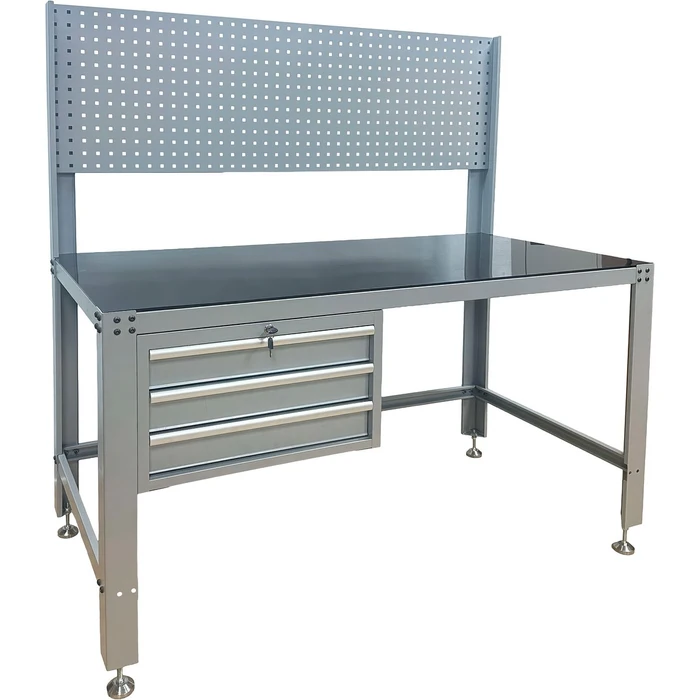 IKH Professional -työpöytä reikälevyllä ja suojalevyllä on suunniteltu vaativaan käyttöön esimerkiksi verstailla, huoltotiloissa ja työpajoissa. Työpöydän reikälevytausta mahdollistaa työkalujen kätevän säilytyksen ja nopean saatavuuden, ja pöytäkannen suojalevy parantaa kestävyyttä ja helpottaa puhdistusta.