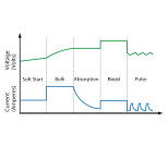 - Soft start (vaihe 1): Alustava akkutesti akun kunnon määrittämiseksi. Jos akku on pahoin purkautunut, laturi aloittaa pehmeän käynnistysvaiheen. Lataus alkaa alhaisella virralla, kunnes akun jännite saavuttaa 10 V.