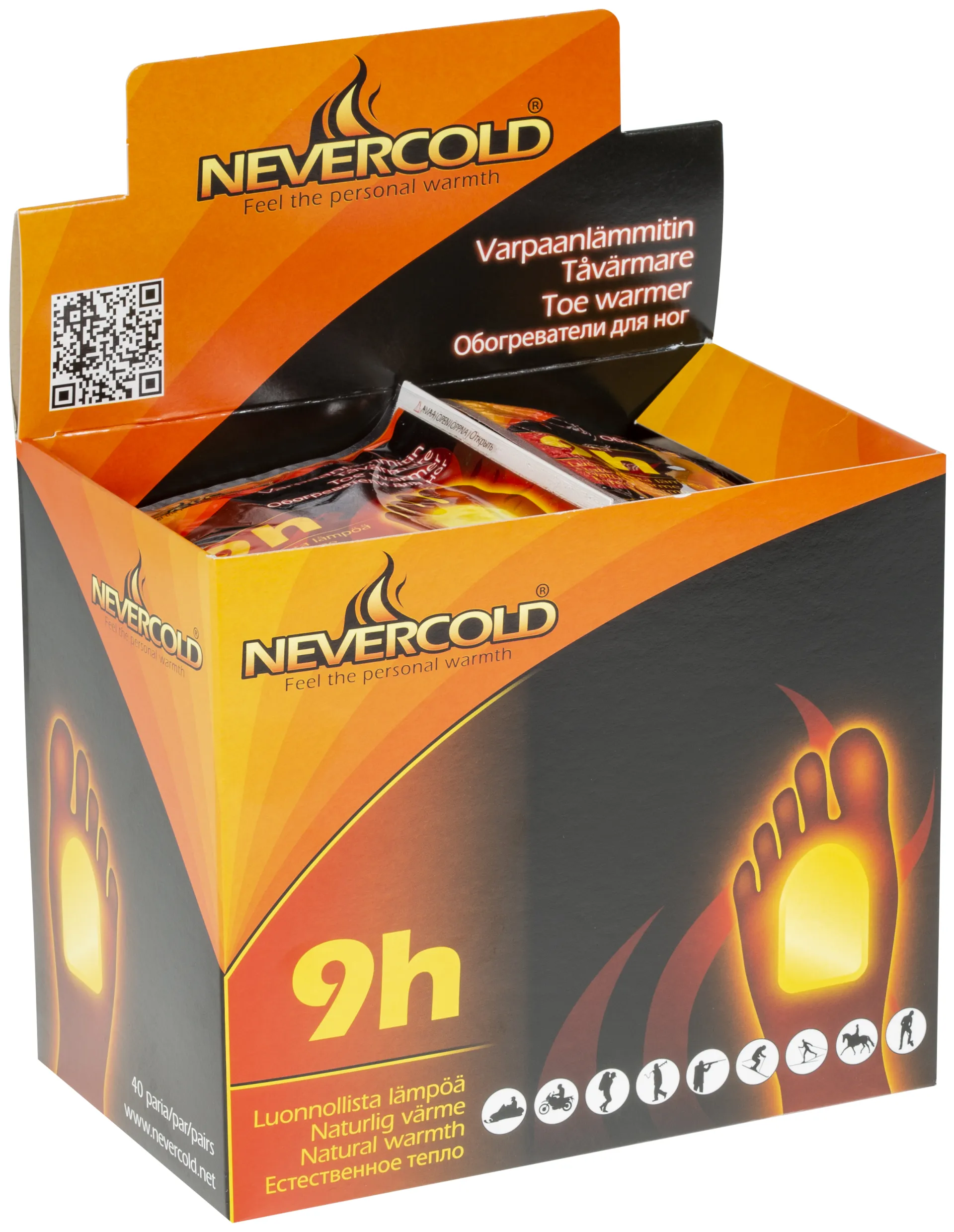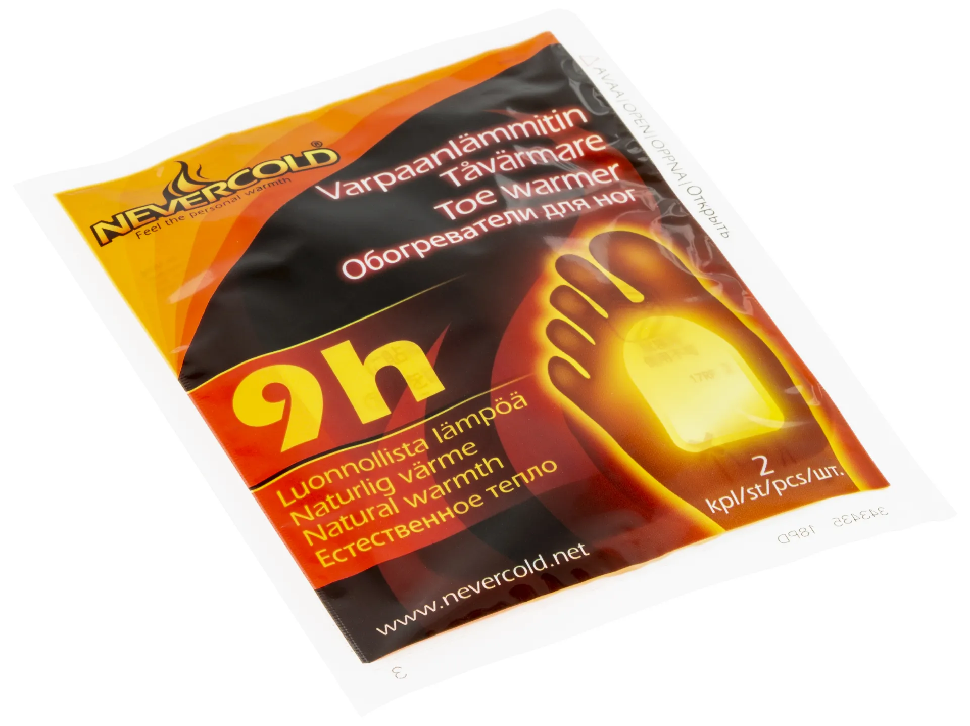 Nevercold-varpaanlämmittimet on suunniteltu pitämään varpaat lämpiminä kylmissä ja vaativissa sääolosuhteissa. Huokoisesta materiaalista valmistetut, tyynymäiset lämmitintyynyt sisältävät tehokkaan seoksen vermikuliittia, rautajauhetta, puujauhetta, aktiivihiiltä ja suolaa.